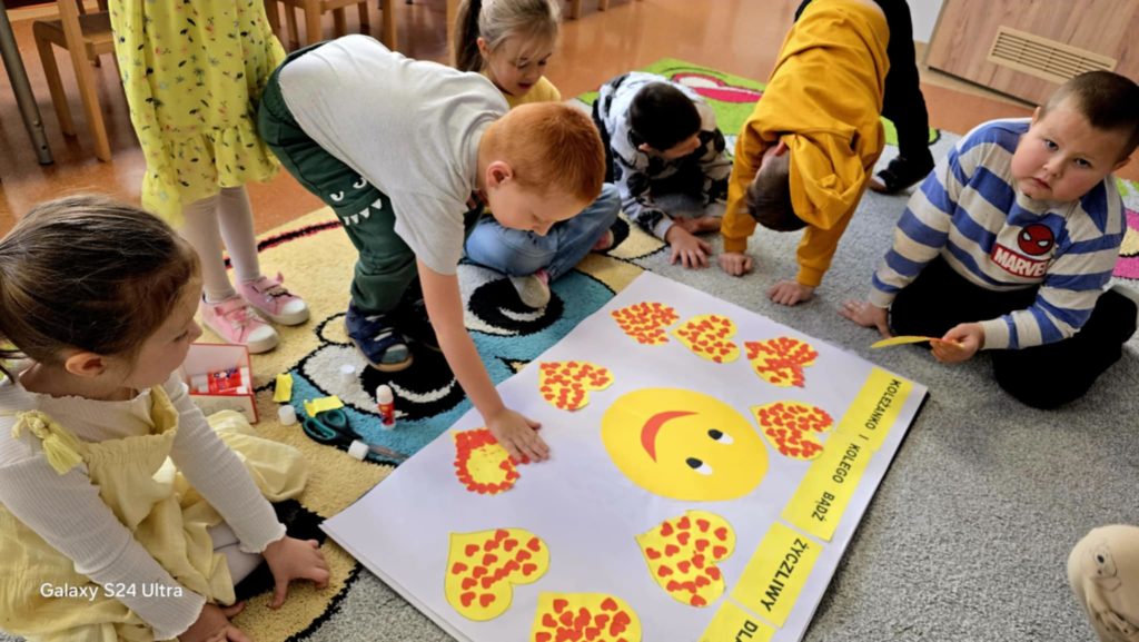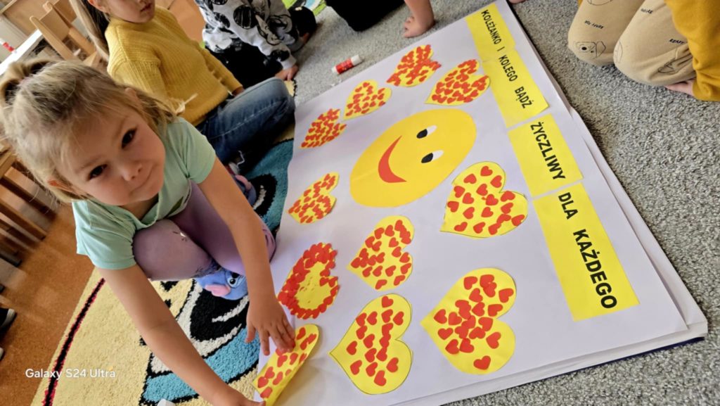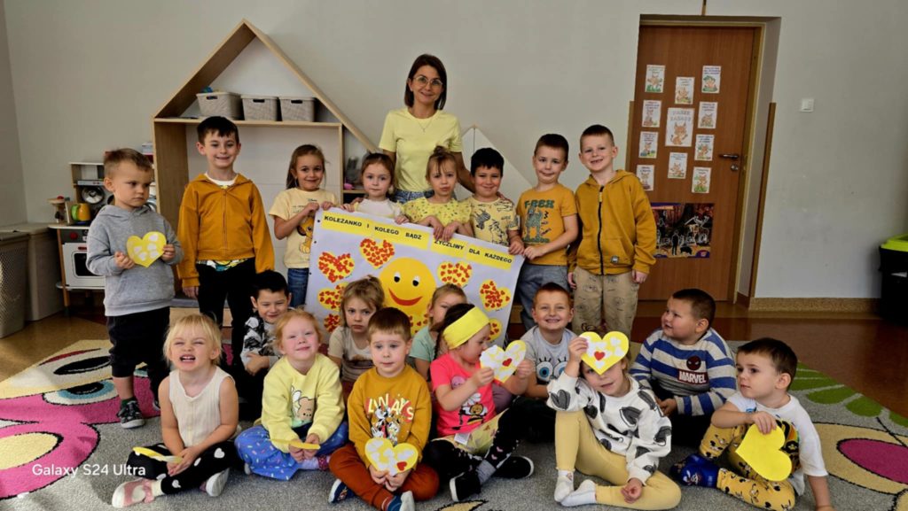 Dzisiejszy dzień upłynął w naszym przedszkolu pod znakiem uśmiechu, dobrych słów i wzajemnego wsparcia. W grupach 5-latków oraz 3–4-latków obchodziliśmy Światowy Dzień Życzliwości – wyjątkowe święto, które przypomina nam, jak wielką wartość mają małe gesty dobroci. Podczas zajęć dzieci rozmawiały o tym, czym jest życzliwość i jak można ją okazywać innym. Przedszkolaki poznały wiele gestów życzliwości, takich jak podanie ręki, uśmiech, powiedzenie czegoś miłego, pomoc koledze lub koleżance w trudniejszej czynności, dzielenie się zabawką czy zaproszenie kogoś do wspólnej zabawy. W formie zabaw ruchowych, historyjek dzieci mogły od razu zastosować te gesty w praktyce, ucząc się, że każdy mały gest może sprawić komuś wiele radości. Przez cały dzień panowała serdeczna, ciepła atmosfera. Dzieci starały się zwracać szczególną uwagę na to, aby być dla siebie jeszcze bardziej miłymi, a każde zachowanie pełne dobroci było wspólnie zauważane i doceniane. Choć nasi przedszkolacy na co dzień są dla siebie życzliwi, dzisiejsze obchody były doskonałą okazją, aby przypomnieć, że warto być dobrym każdego dnia, nie tylko od święta. Wspólnie spędzony czas pokazał, jak ważne jest, by zauważać potrzeby innych, pomagać sobie nawzajem i czerpać radość ze wspólnej zabawy.